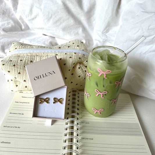 Trinkglas Schleifen-Motiv mit Deckel & Strohhalm