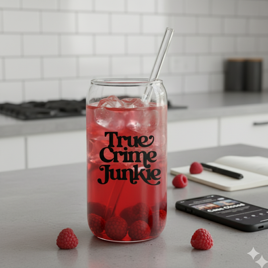 Trinkglas "True Crime Junkie" - mit Bambusdeckel & Glasstrohhalm